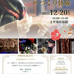 飛騨の銀白の世界を彩る。今年も開催!平湯民俗館で花もちづくり2025年12月20日土曜日10:00~15:00会場:平湯民俗館■小さな花もちブーケづくりお一人様ずつ、持ち帰れる小さな花もちを作れます。ご家族やご友人へのお土産にも最適です!料金 500円/名<20個限定>■大きな花もち作り体験みんなで協力して大きな花もちを作り、それを平湯温泉に年末年始の飾りとして展示します。 申し込みは平湯温泉観光案内所までお電話ください。0578-89-3030<span class="a_GcMg f