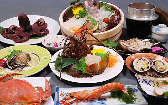 タコボイル・タコ飯・旬の活造り・伊勢海老活造り・貝の刺身・カニボイル又は伊勢海老鬼殻焼・旬の貝のボイル又は焼き・煮魚・揚物・海老の塩焼・茶碗蒸(冬季のみ)・酢物・汁物・香物 のついたコースです。