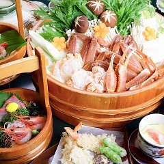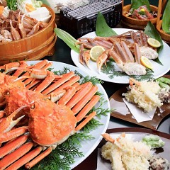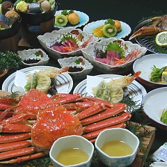 ゆで姿蟹・焼蟹・蟹すき・天ぷら・カニ刺し・茶碗蒸し・雑炊セット・フルーツ 小学生のお子様は、お刺身、グラタン、陶板...