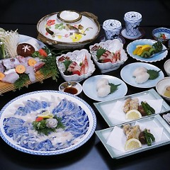 ゆで姿蟹・焼蟹・てっちり鍋・ふぐの竜田揚げ・魚刺身・茶碗蒸し・雑炊セット・フルーツ 小学生のお子様は、お刺身、グラ...