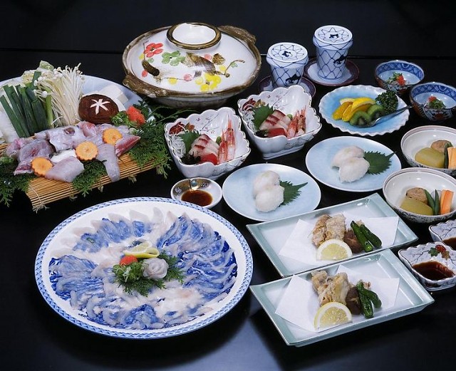 ひれ酒・てっさ・湯引き・魚刺身・てっちり・焼きふぐ・ふぐの竜田揚げ・ふぐ寿司・茶碗蒸し・雑炊セット・フルーツ