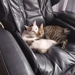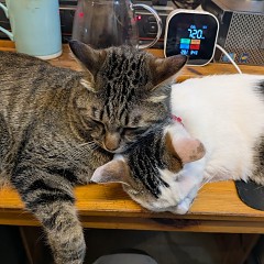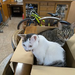 我が家の看板猫の、トラちゃん(オス、キジトラ猫)とサクラちゃん(メス、白猫)です。今年2歳になります。触っても嫌がりませんが、店の外に出さないようご注意ください。